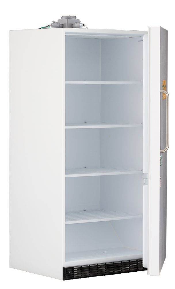 Hazardous Location (Explosion Proof) Freezers meet NFPA and OSHA guidelines for Hazardous Location, Class 1, Division II, Groups C & D guidelines. Units are not intended for use in general clinical or research laboratories. All spark generating electrical components and connections (compressor, thermostat) are isolated and sealed in vapor-proof enclosures. Electrical wiring is hardwired for additional safety measures. Models features a mechanical thermostat sealed in UL listed explosion proof box, keyed door locks, and a one-year parts and labor warranty.